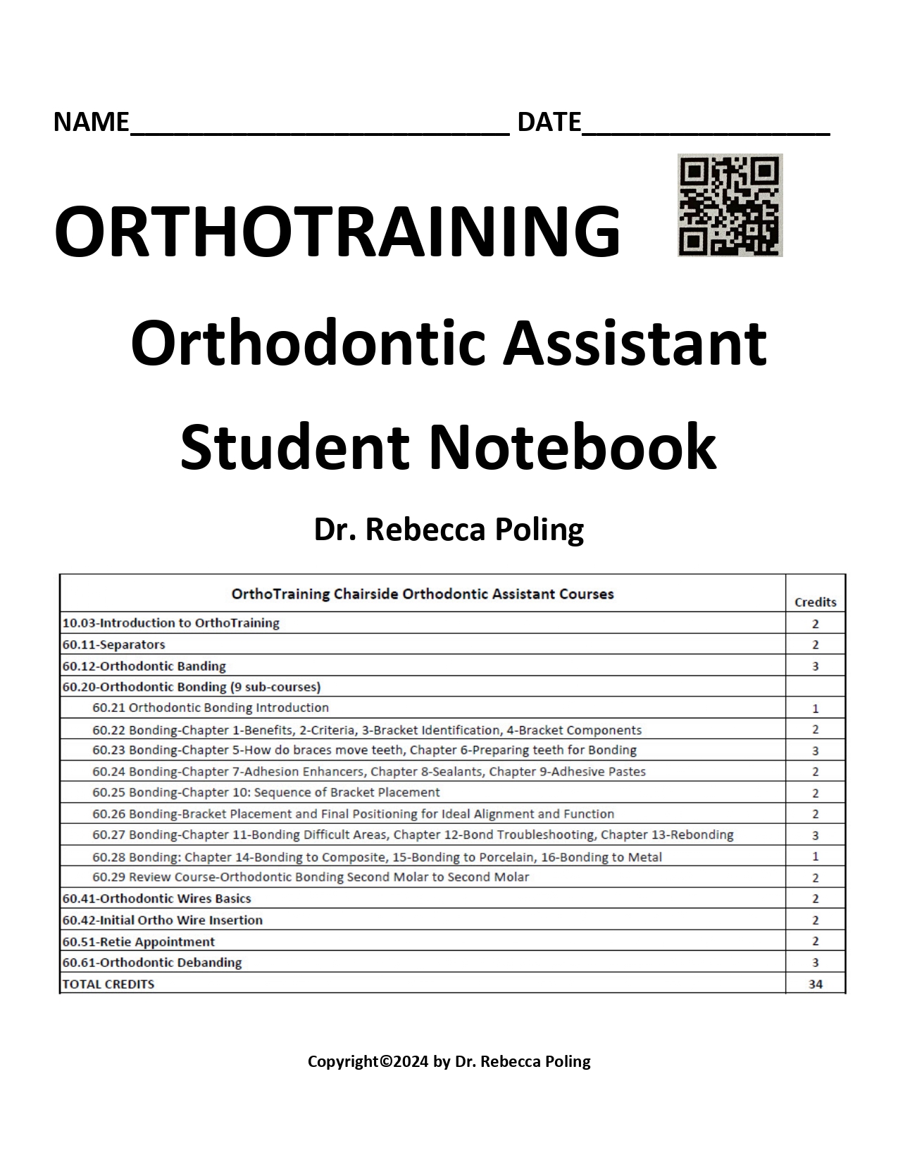 The 2024-OrthoTraining Orthodontic Assistant Student Notebook* is the printed Hands-on Training Notebook for students to use during each weekly Hands-on Training Session when taking the 60.00-Orthodontic Assistant In-Office 60-Day Comprehensive Training Course. Each learner should have this Notebook.