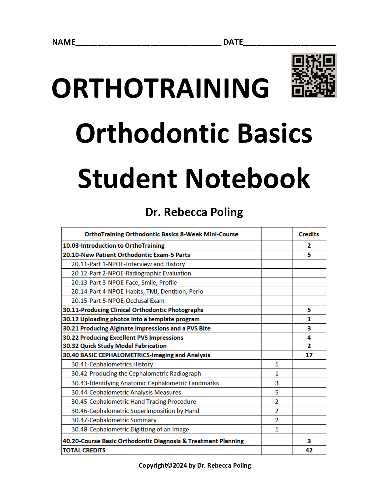 The OrthoTraining Orthodontic Basics Student Notebook* is the printed Hands-on Training Notebook for students to use during each weekly Hands-on Training Session when taking the Orthodontic Basics 8-Week In-Office Comprehensive Course. Each learner should have this Notebook.