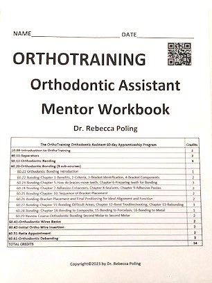 The 2024-OrthoTraining Orthodontic Assistant Mentor Workbook* (303 pages) is the complete guide for the Mentor supervising students in the 60.00-Orthodontic Assistant 60-Day In-Office Comprehensive Training Program. These students want to learn how to work directly with patients in placing and adjusting orthodontic braces and other orthodontic appliances, in assessing patient progress during treatment, working closely with the orthodontist, and in removing orthodontic appliances.